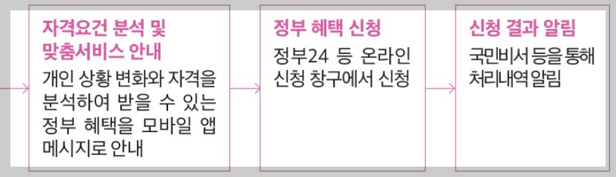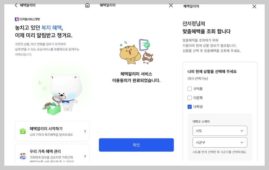 한 번 가입하면 별도 접속 없이도정부가 보유한 정보를 기반으로 나의 상황 변화를 파악해받을 가능성이 높은 공공서비스를 자동으로 추천 및 알림해 줍니다.즉, 내가 일일이 찾아보지 않아도정부가 직접 내게 맞는 혜택을 알려주는 시스템입니다.이전처럼 여러 공공기관 홈페이지를 일일이 찾아볼 필요 없이,혜택알리미 한 곳에서 현금, 현물, 이용권 등 다양한 복지정보를 한눈에 확인 할 수 있어훨씬 쉽고 편리하게 정부혜택을 챙길 수 있습니다.