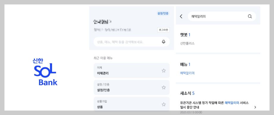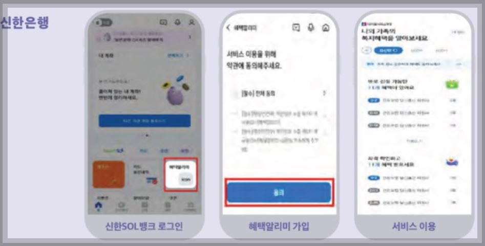 1. 신한sol 뱅크 앱 실행=> 2. 하단의 [전체 메뉴] => 3. ‘혜택알리미’ 검색 -> 서비스 실행=> 4. 본인 또는 가족 혜택 선택 후 시작 5. 이용 동의 및 정보 입력 6. 본인의 상황에 맞는 항목 선택