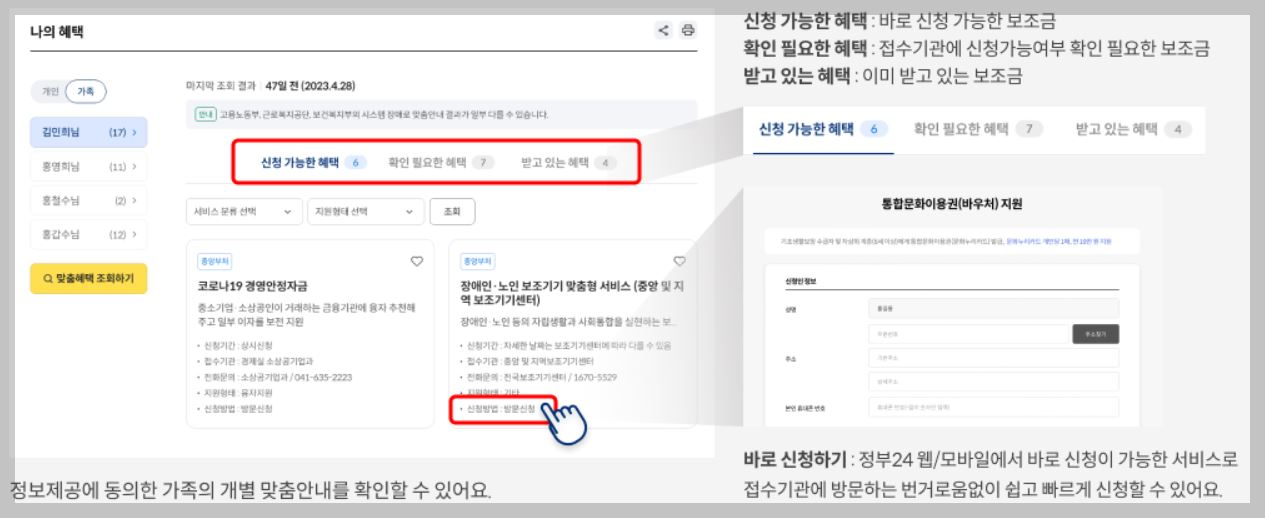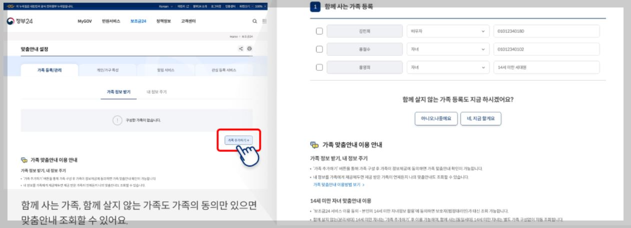주민등록상 동일세대 가족뿐만 아니라 가족관계등록부상 직계존비속 관계의 가족도 추가해서 맞춤 안내 조회 살 수 있습니다.