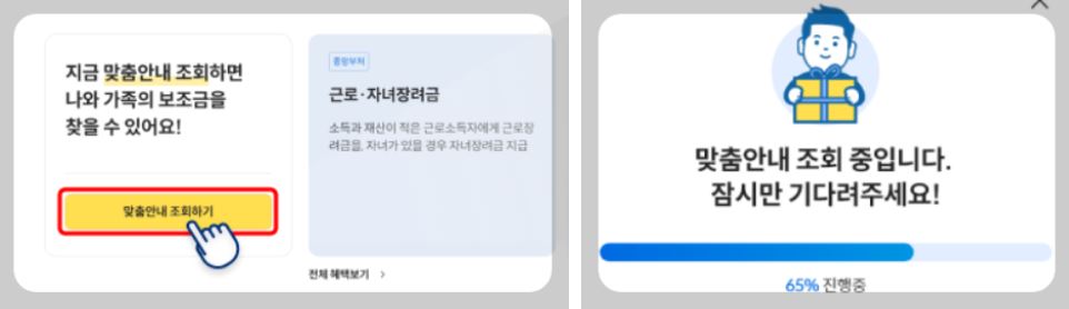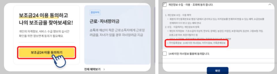3.14세 미만 자녀의 맞춤아내 조회는 법정대리인의 동의가 있으면 가능하며 동의가 끝나면 행정기관이 보유하고 있는 개인자격및 수급정보를 활요하여 맞춤안내를 조회합니다.