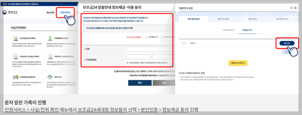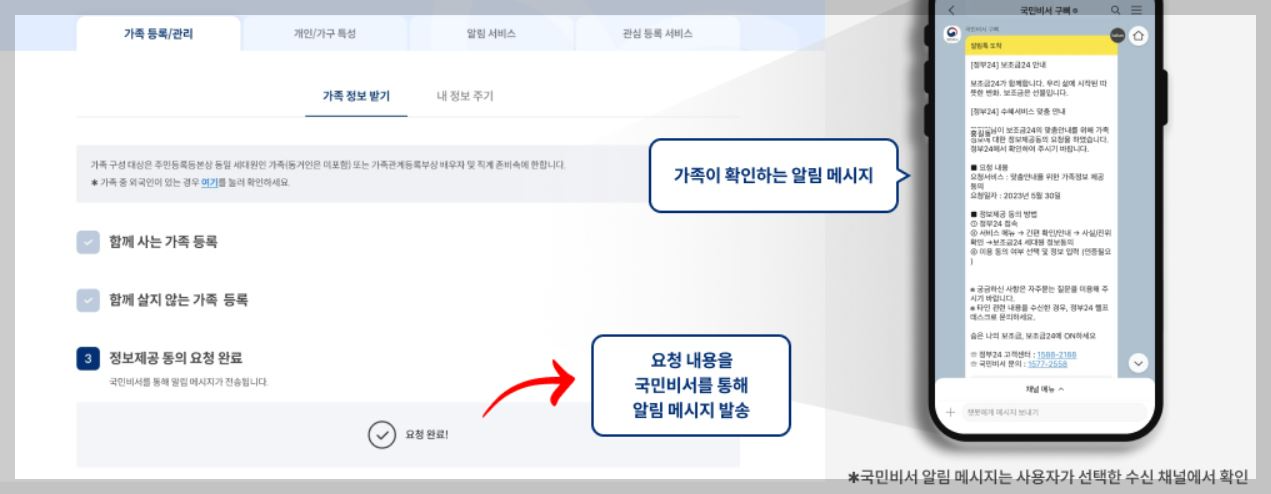 가족의 보조금 조회를 위해 정보제공 요청을 하면 문자를 통해 안전하게 알림메시자가 전달됩니다.