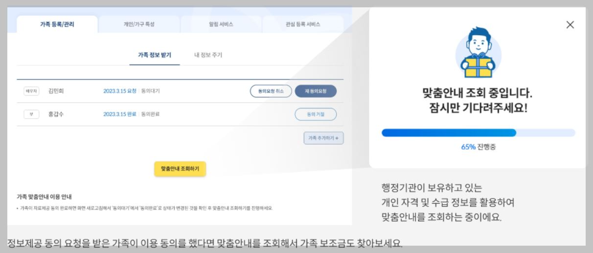 정보제공 동의 요청에 동의한 가족의 개인,자격정보를 활용하여 맞춤안내 조회가 실행됩니다.