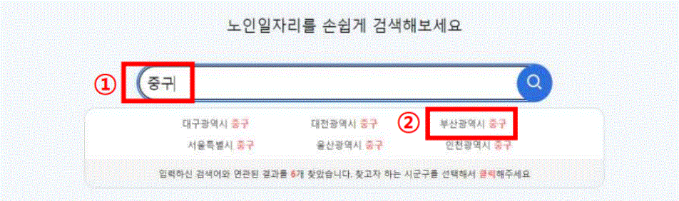 1) 먼저 위에 제가 준비한 링크 노인일자리여기에 접속하여 ① 메인화면 [검색바]에서 ‘거주 지역 행정명’ 입력 후 검색후 ② 해당 지역구 선택하시면됩니다.