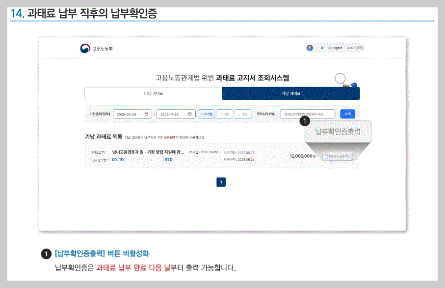 2.납하기 버튼 활성화 : 납부기한이 지난 과태료는 납부하기 버튼이 비활성화 됩니다. 납부기한이 지난 과태료관련 문의사항은 관할 지방노동관서 고용관리과로 확인하시길 바랍니다.