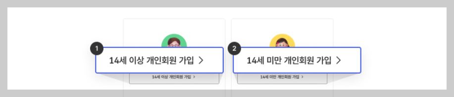 2. 14세이상 개인회원가입을 선택하거나 14세미만이경우 14미만 개인회원가입을 선택합니다.