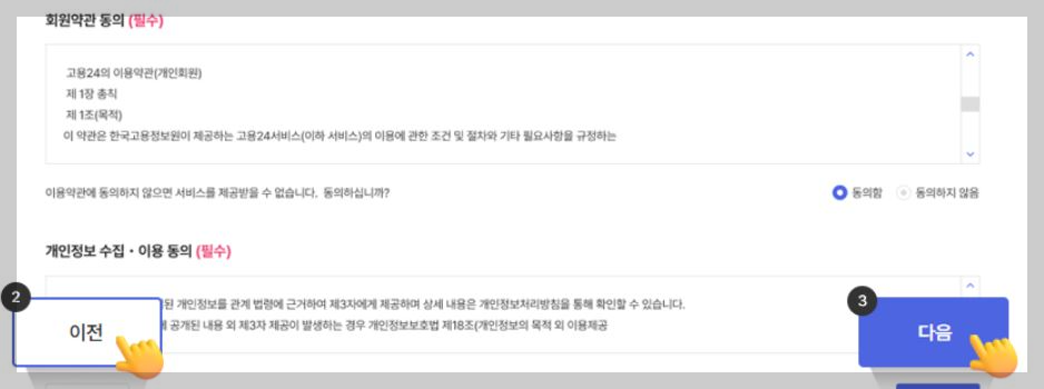 1. 고용24 홈페이지 우측상단 회원을 선택하여 개인회원가입을 선택합니다.